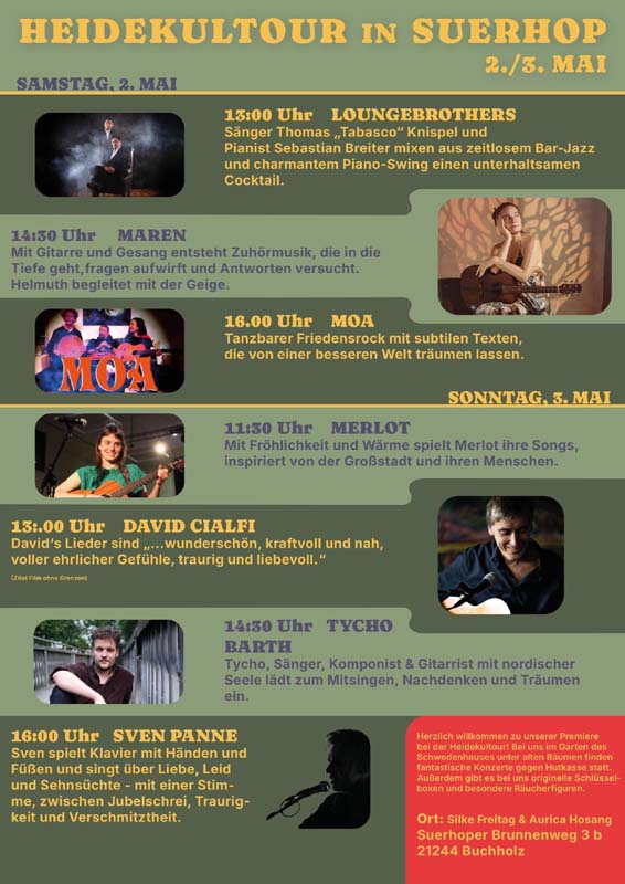 Meine Band MOA wird am 02. Mai ab 16.00 Uhr ein Konzert bei Sille und Aurica in Suerhop spielen. Also kommt vorbei und habt mit uns einen schönen Nachmittag!