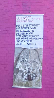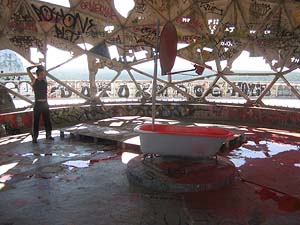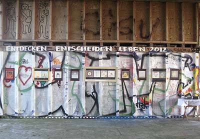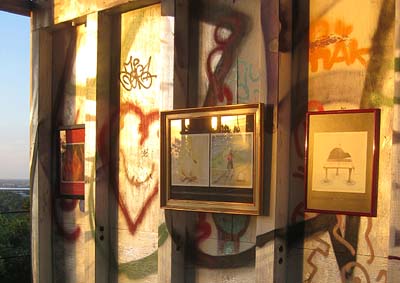 Eine der Kuratorinnen, Rotraud von der Heide hatte vier Wände einer oberen Etage des Radarturms farblich gestaltet, eine Anrufung an Mutter Erde an die gelbe Wand gebracht und die Plattform mit Liegestühlen zu einem wunderbaren Platz an der Sonne verwandelt