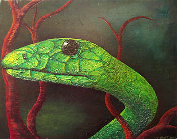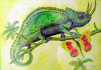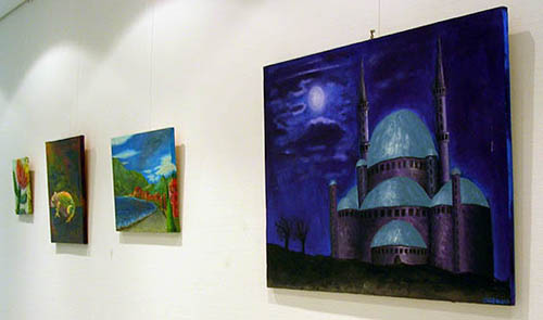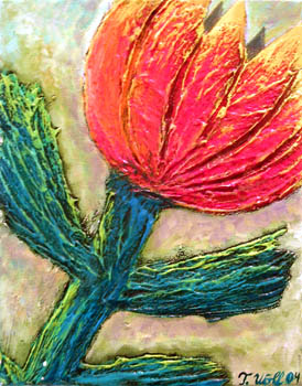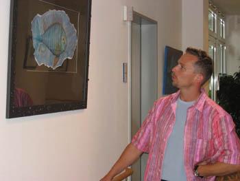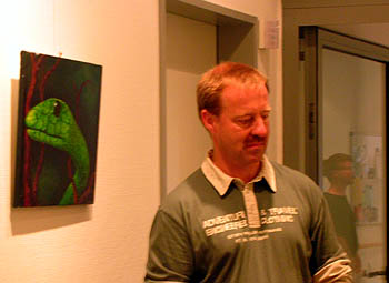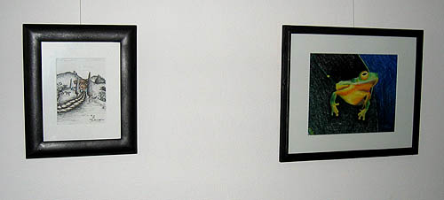 ~ Herr Wolf ~ experimentiert gerne mit verschiedene Techniken. So sind sowohl farbintensive Ölbilder als auch Buntstiftzeichnungen in seinem Repertoire. Die ausgestellten Werke reichen bis in das Jahr 1997 zurück. Wir finden uns in einer mediterranen Landschaft wieder, werden von Karrikaturen zum Schmunzeln gebracht um uns im nächsten Augenblick mit schattenhaften Traumgestalten konfrontiert zu sehen.