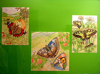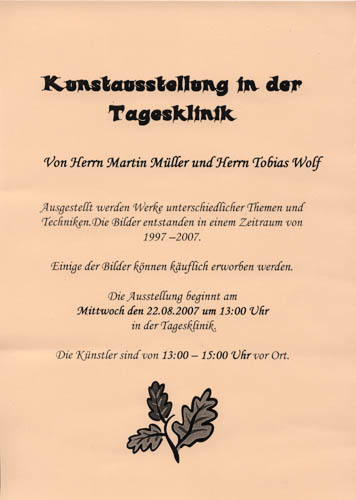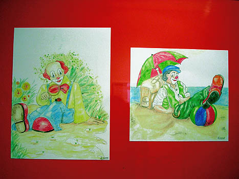 ~ Herr Müller ~ hat 2002 bei einem Klinikaufenthalt mit der Malerei begonnen. Grosse Freude bereitet ihm das Zeichnen mit Buntstiften und das anschliessende Aquarellieren. Herr Müller findet seine Motive auf Postkarten und lässt sich gerne von Bildern anregen. Auf dieser Ausstellung begeistert er zum Beispiel mit seiner Schmetterling- oder mit seiner Clownserie die die 4 Jahreszeiten interpretiert.